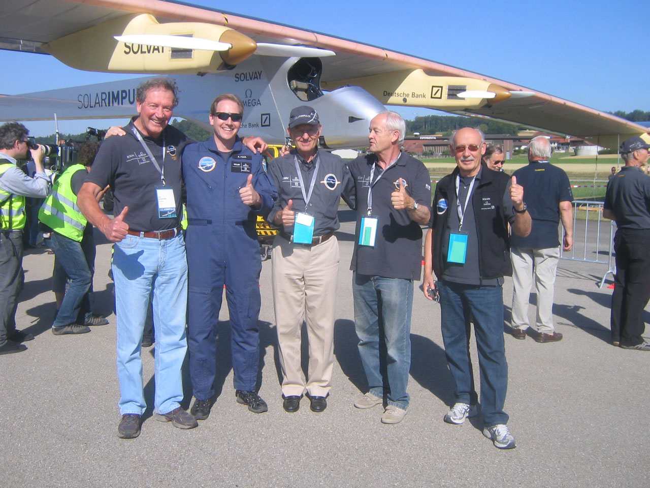 Members of the SolarImpulse team, mediated by ALR, celebrate the success of the 26 hours flight on the 8th of July 2010